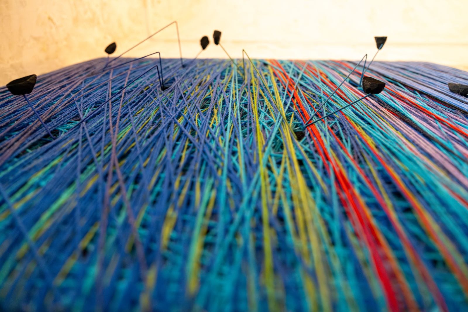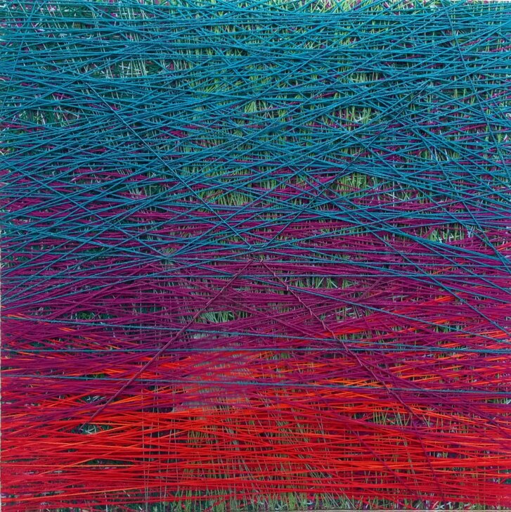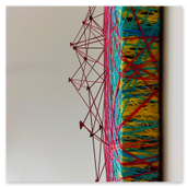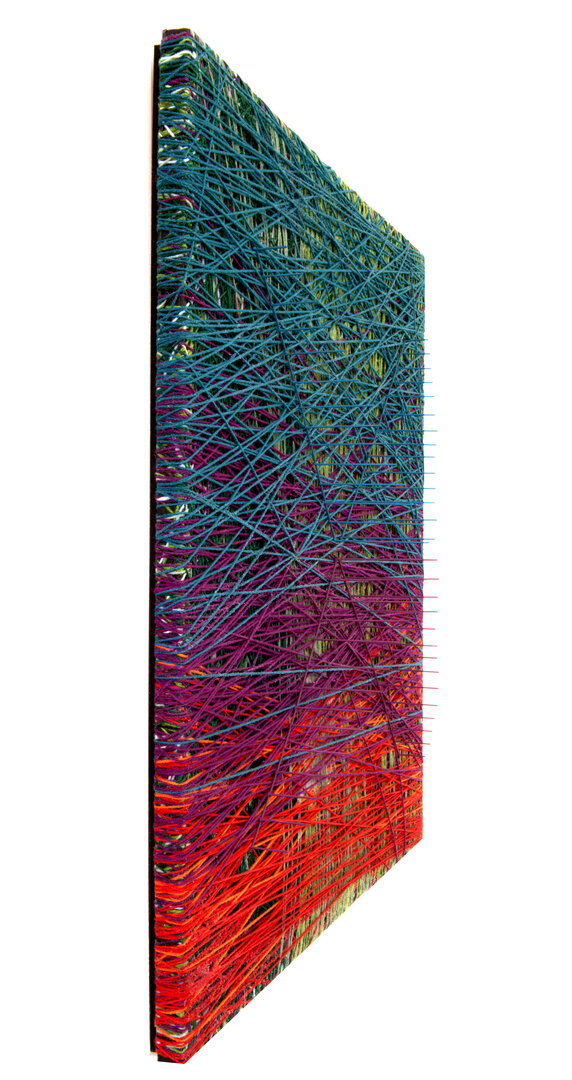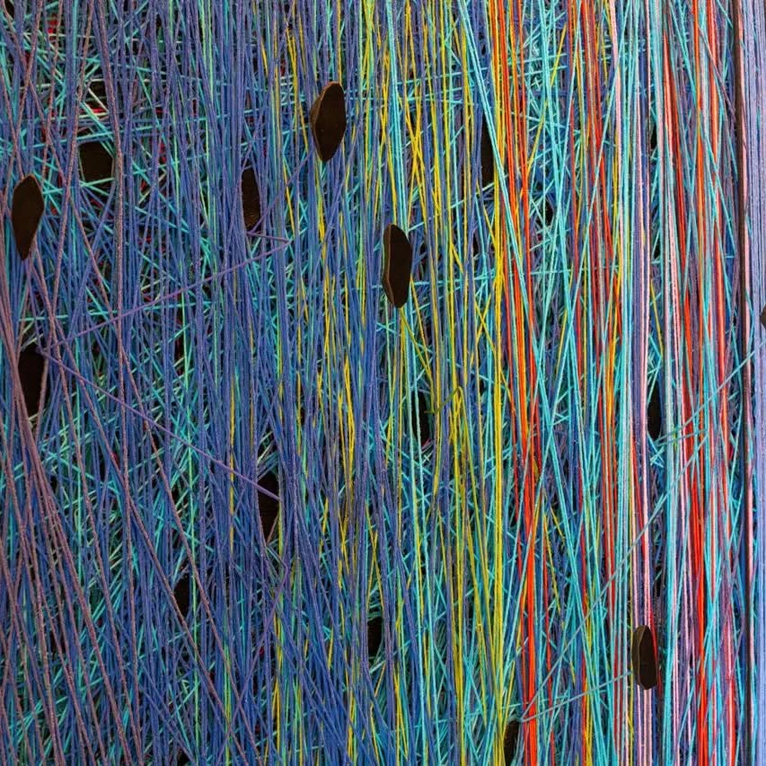 Mixed media (acrylic threads, brass metal structure, acrylic on wood)