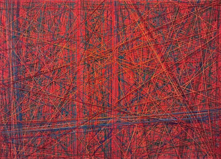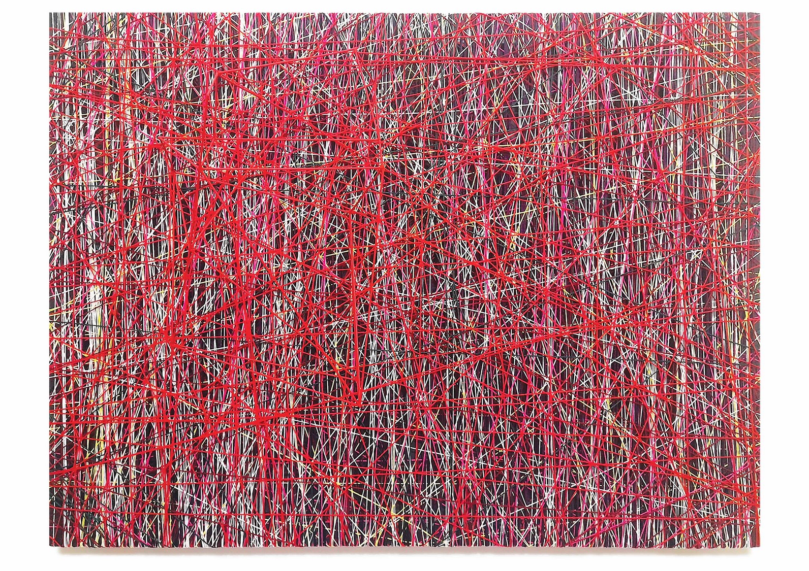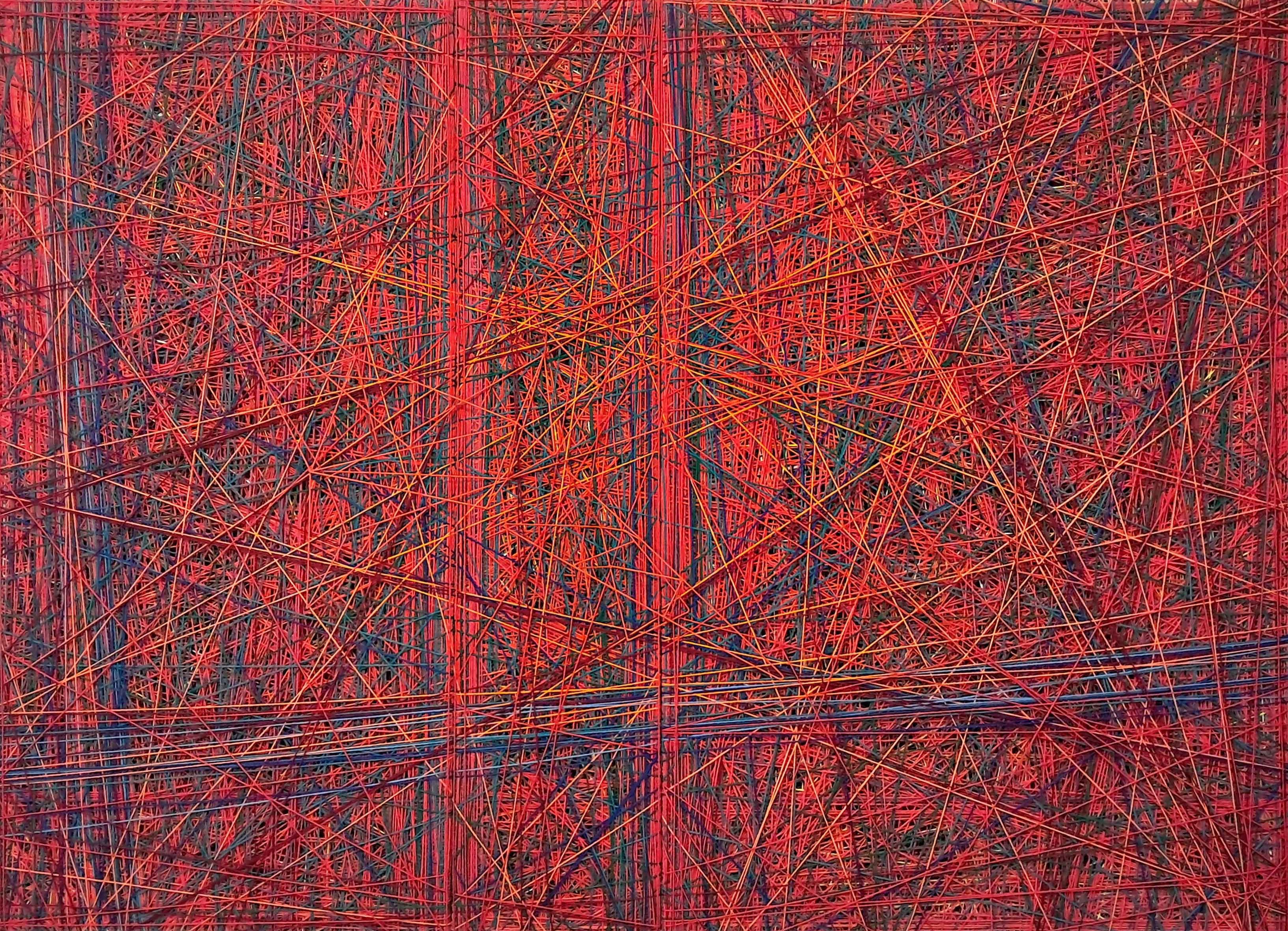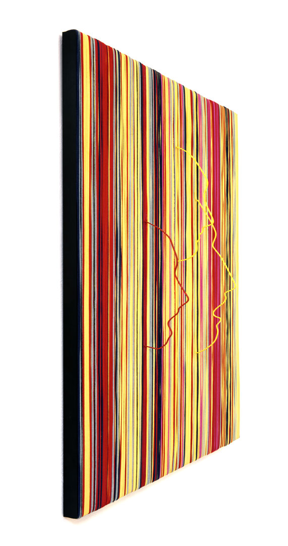 Mixed media (acrylic threads, brass metal structure, acrylic on wood)