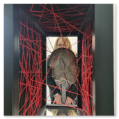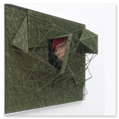 Mixed media (fabric ribbons, synthetic wool, acrylic on wood and plaster)