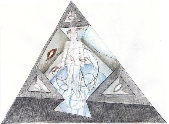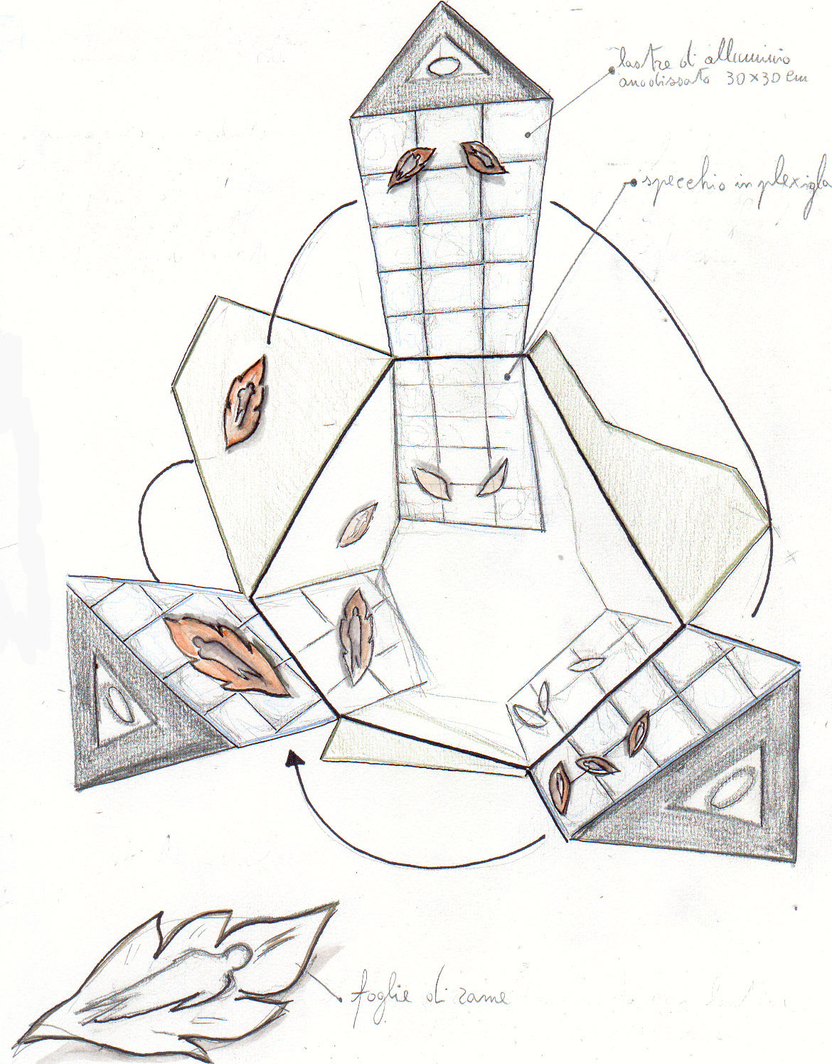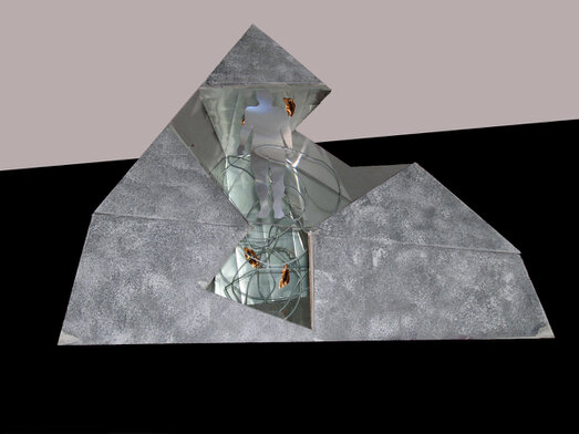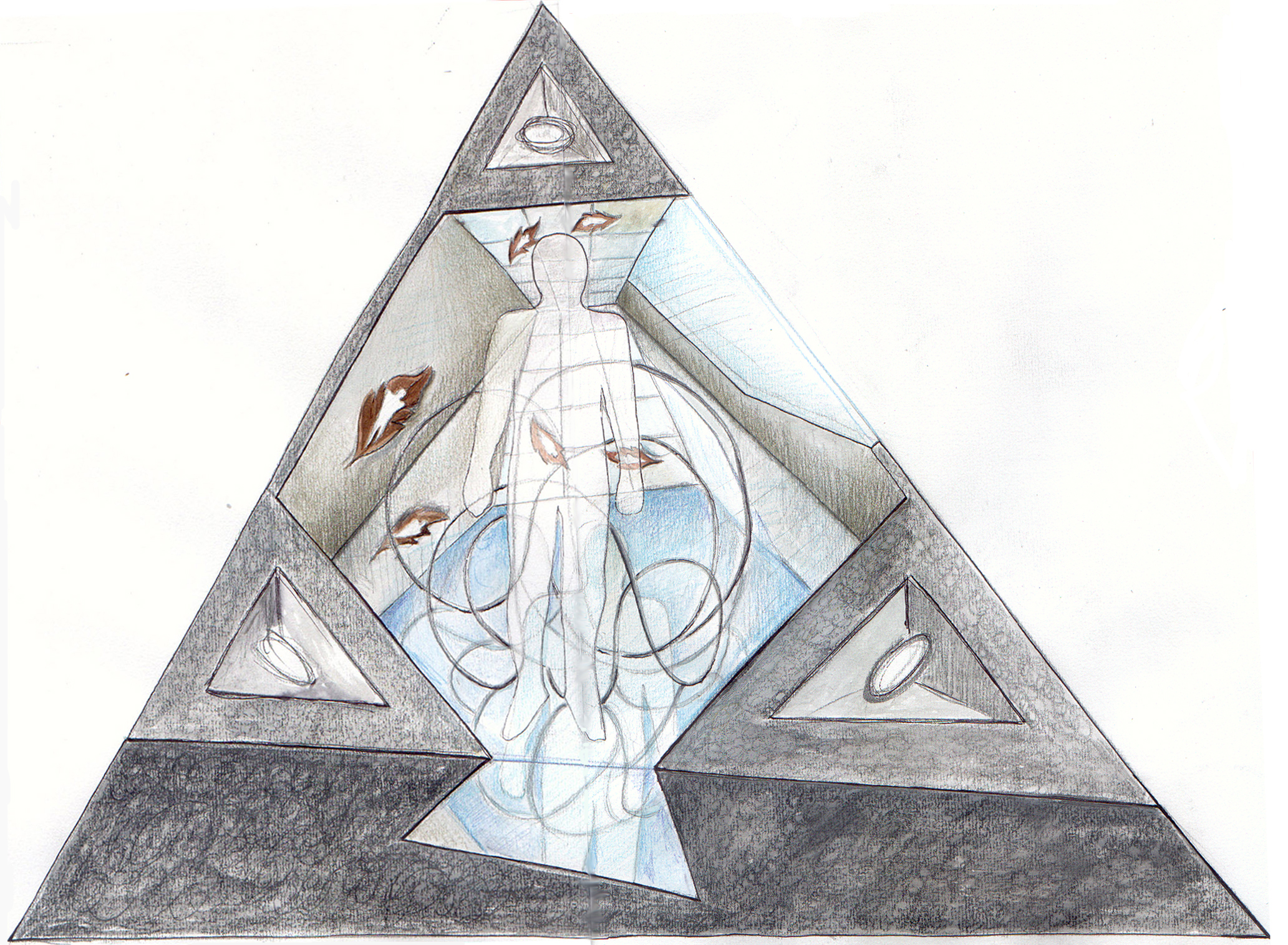 Sul vetro di copertura della piramide, centrato rispetto al vertice superiore, vi è una grossa sagoma di uomo realizzata con lenti di ingrandimento in fogli di materiale plastico (o in alternativa, eseguita mediante sabbiatura del vetro). Tale sagoma pur non essendo particolarmente contrastante con la parte rimanente del vetro, consentirà di riflettere i raggi solari sia all'interno che all'esterno dell'opera e permetterà di duplicare (attraverso la rifrazione nello specchio) l'immagine dell'uomo "fatto di luce", creando un notevole allargamento prospettico.