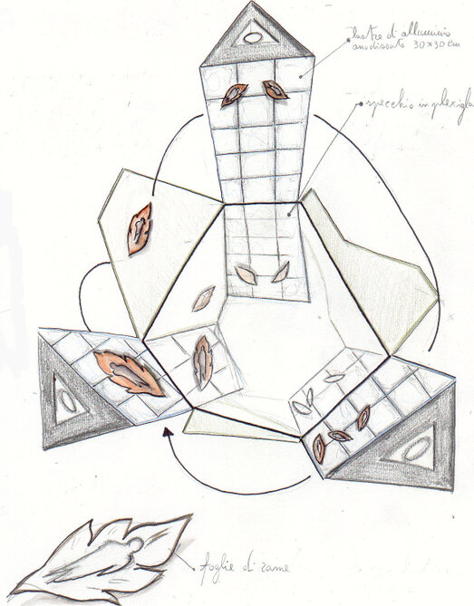Di notte invece, tre raggi levano verso il cielo la loro LUCE ,e disegnano nell'aria e nell'acqua, la forma "regolare della piramide". La forma geometrica fatta di luce è l'essenza stessa del "ricordo" di qualcosa che è presente nello spirito ma che non è più materiale.