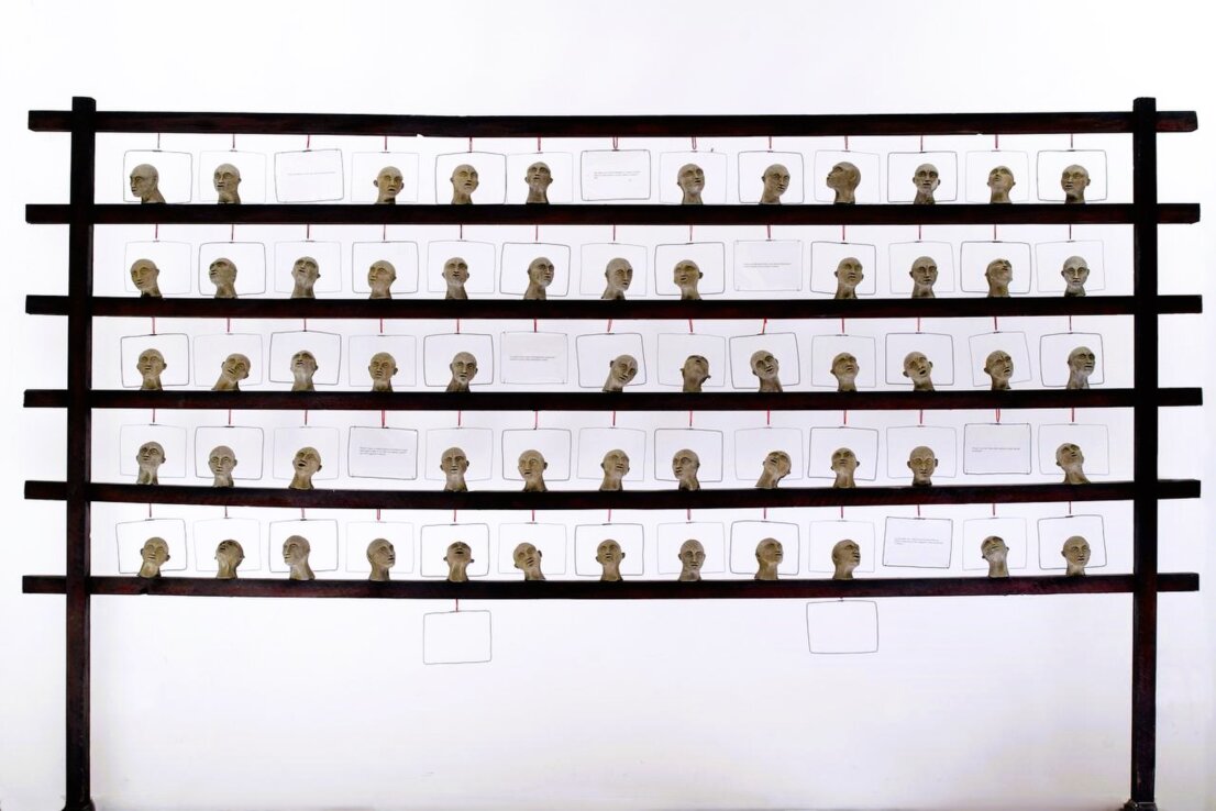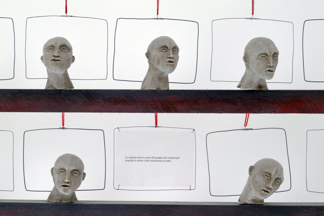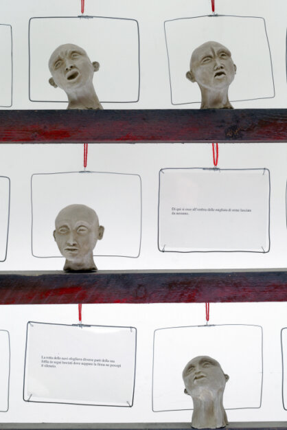 L’opera, pur radicandosi in una riflessione sul presente, trae ispirazione da un antico rito shintoista: una struttura lignea simile a uno spartito musicale, su cui vengono appese pergamene e tavolette votive tramite fili rossi, lasciate ondeggiare dal vento. In O di Otranto, le pergamene lasciano spazio a 58 volti scolpiti – simili, ma tutti diversi – ciascuno incorniciato da un rettangolo in filo di ferro che richiama la forma della pergamena. Dove i volti mancano, compaiono scritte: sette frasi “surreali” che possono essere lette senza un ordine definito, lasciando al visitatore la libertà di costruire un proprio percorso interpretativo.